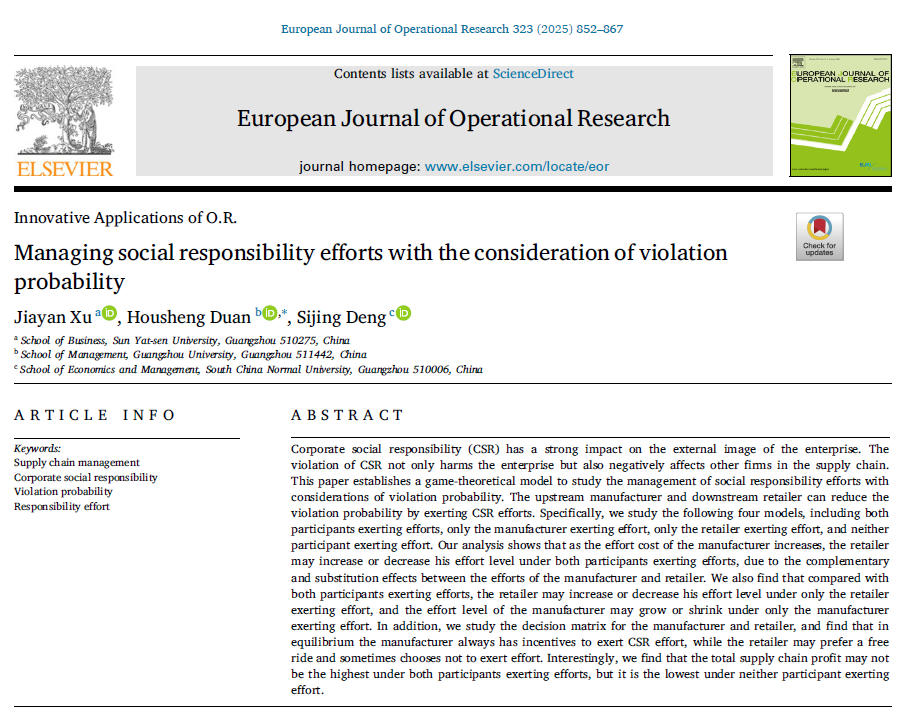消费者不仅关注产品和服务本身,也越来越重视企业社会责任,如何有效管理供应链中的企业社会责任是个难题。中山大学徐佳焱(第一作者)、广州大学段后胜(通讯作者)和华南师范大学邓思婧在国际权威期刊European Journal of Operational Research上发表题为《Managing social responsibility efforts with the consideration of violation probability》的论文,深入分析了应该如何管控供应链中不同企业的社会责任行为。