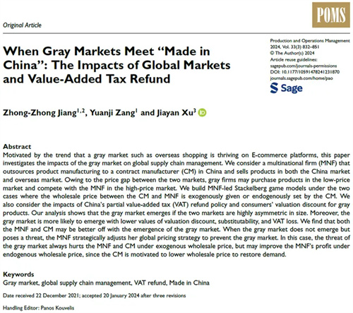 跨境电商的蓬勃发展助长了代购等新型灰色市场,为跨国企业的全球供应链管理带来挑战。中山大学管理学院徐佳焱副教授与合作者(东北大学蒋忠中教授及臧元基博士生)近期在UTD24顶级期刊Production and Operations Management发表题为《When Gray Markets Meet “Made in China”: The Impacts of Global Markets and Value-Added Tax Refund》的研究论文。该成果基于“中国制造”情境,对比分析了跨国企业应对灰色市场挑战的几种策略,并揭示了全球市场环境、中国的出口退税制度及合同制造商的策略性行为等重要因素的影响机制。