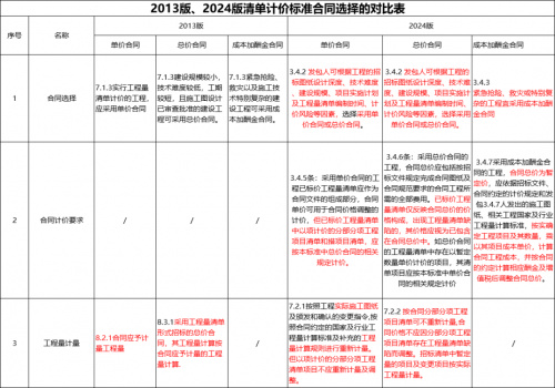 解析:①合同选择不同。2013与2024版清单规范合同选择上有所不同,2013主要从项目清单形式、规模大小以及紧急复杂程度来选择合同价格形式。而2024版主要强调发包人根据项目特点难易程度自主选择合同的价格形式。把主动权交给发包人来确定,这就要求发包人对工程项目有前瞻性、预见性,根据以往的经验来选择适合的合同价格形式。