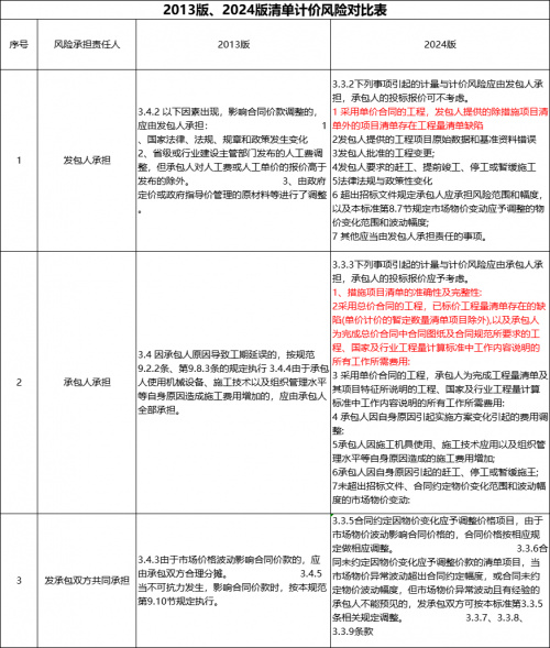 建设项目在签订建设工程合同中往往由于风险范围描述不具体或者模糊不清,从而造成工程索赔与反索赔的现象层出不穷。2024版清单计价规范中对承发包双方计价风险进行了进一步明确。如下对比表: