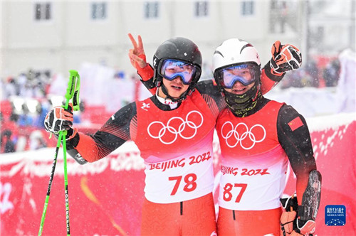 2月13日,中国选手徐铭甫(左)和张洋铭在北京冬奥会高山滑雪男子大回转比赛后合影。新华社记者连振摄