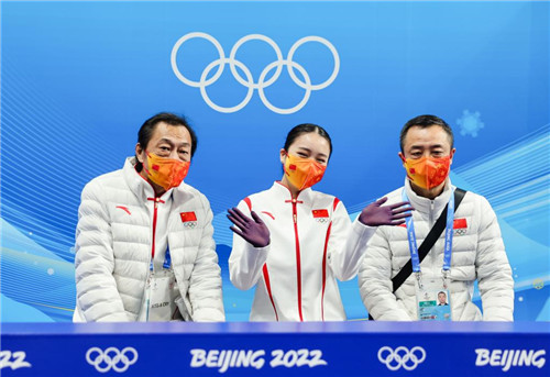 2月15日,朱易(中)在北京冬奥会花样滑冰女子单人滑短节目比赛后。新华社记者曹灿摄