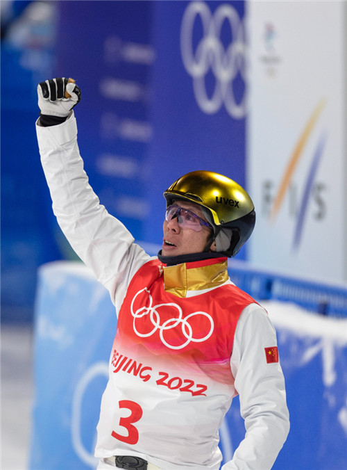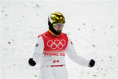 2月15日,中国选手贾宗洋在北京冬奥会自由式滑雪男子空中技巧资格赛上获得晋级名额。新华社记者费茂华摄