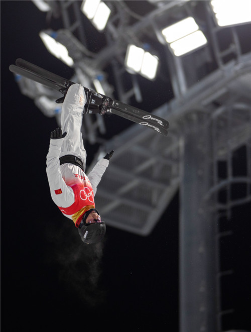 2月15日,中国选手齐广璞在北京冬奥会自由式滑雪男子空中技巧资格赛中。新华社记者费茂华摄