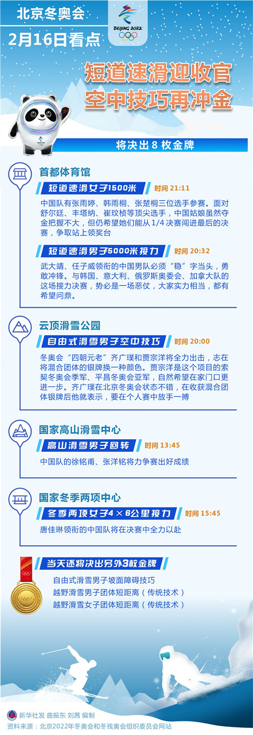 新华社北京2月15日电(记者张泽伟、王恒志)北京冬奥会16日将决出8枚金牌,其中短道速滑进入最后一个比赛日,将产生男子5000米接力和女子1500米两枚金牌,期待中国健儿出色发挥、完美收官。另外,齐广璞、贾宗洋两位“四朝元老”将在自由式滑雪男子空中技巧项目全力冲金。