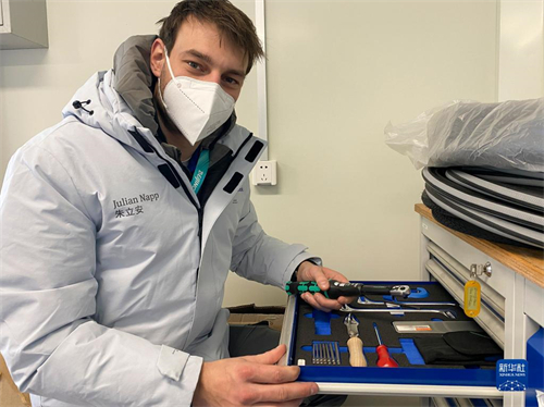 2月25日,在张家口赛区云顶滑雪公园,矫形器、假肢与轮椅维修中心的维修技术人员朱利安·纳普展示工作中需要使用的各类工具。