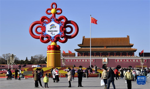 这是2月27日拍摄的已完成北京冬残奥会会徽更换的天安门广场“精彩冬奥”主题花坛。