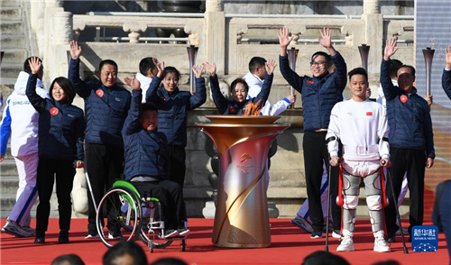 3月2日,残疾人运动员、残联等各界人士代表在北京冬残奥会火种汇集仪式上手持采火棒登上主席台,用取自九个点位的火种共同点燃仪式火种台。新华社记者陶希夷摄