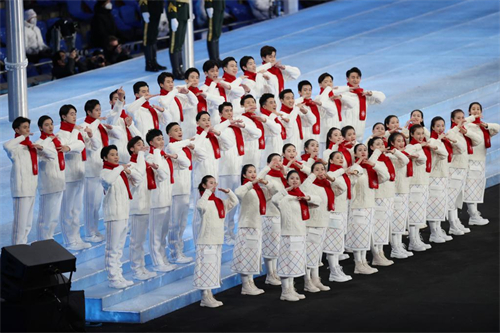 3月4日晚,北京2022年冬残奥会开幕式在北京国家体育场举行。这是人们用手语“演唱”国歌。新华社记者 许雅楠 摄