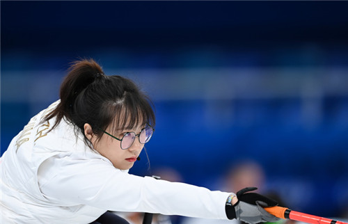 3月9日,中国队选手闫卓在北京冬残奥会轮椅冰壶循环赛中掷壶。新华社记者张博文摄