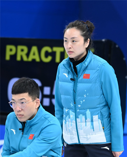 3月9日,中国队教练岳清爽(右)在北京冬残奥会轮椅冰壶循环赛前指导队员练习。新华社记者任超摄