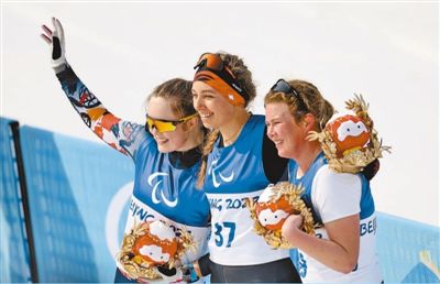 3月9日,北京冬残奥会残奥越野滑雪女子短距离自由技术站姿组决赛后,获奖运动员在赛场合影。本报记者 陶相安摄