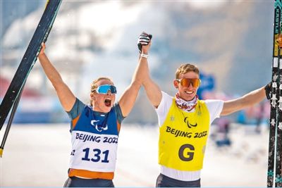 3月9日,北京冬残奥会残奥越野滑雪女子短距离自由技术视障组比赛结束后,奥地利代表团运动员埃德林格(左)和她的引导员庆祝夺金。本报记者 张武军摄