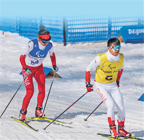3月12日,中国代表团运动员王跃(左)和引导员李亚林在北京冬残奥会残奥越野滑雪女子中距离自由技术视障组比赛中。
