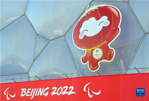 3月1日,国家游泳中心外拍摄的北京冬残奥会吉祥物“雪容融”主题元素。新华社记者任超摄