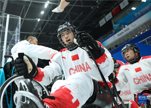3月11日,中国队球员在北京2022年冬残奥会残奥冰球半决赛入场。新华社记者兰红光摄