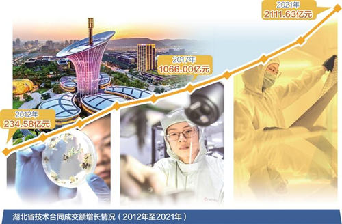 “鄂来拍”“鄂来揭”“鄂来投”和“联百校、转千果”等系列活动让科技成果集聚效应加快形成。2021年,全省技术合同成交额突破2100亿元,同比增长25%,其中技术吸纳达1145亿元,同比增长36.84%,提升了企业承接科技成果的能力,推动企业产品从价值链中低端迈向中高端。