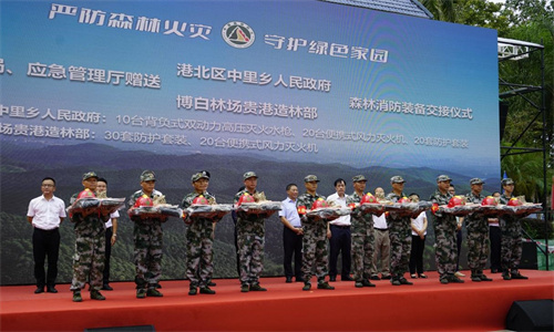 图为与会领导为港北区中里乡半专业森林消防队伍赠送森林消防装备。关雅雯摄