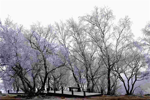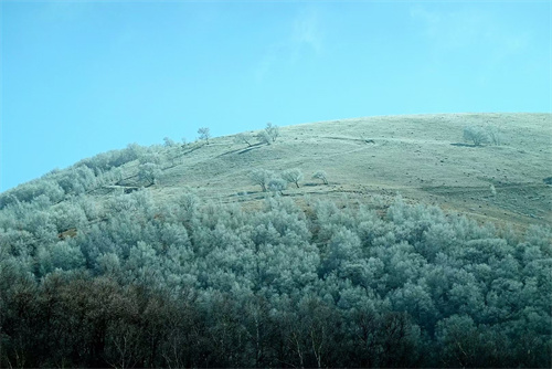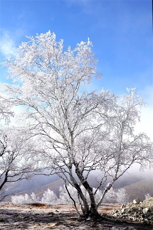 漫山白桦先卸去了金黄裙摆,换上蓬松的洁白“绒衣”,枝桠间凝着的冰晶,像谁随手缀满了细碎的钻石。