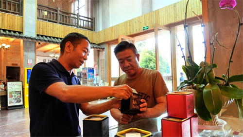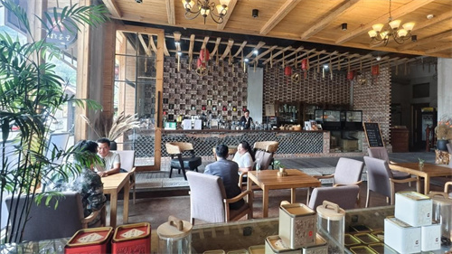 在客户经理指导下,封正奎在酒店大堂规划出了“公益服务驿站”“文旅产品展区”“云端咖啡专区”。在文旅展区,云雾茶、虾青素、苗绣工艺品陈列其间,每件商品都附有“扫码溯源”功能。“我要让每一包茶叶都讲好屏边故事。”他指着展柜中的商品向游客介绍道。
