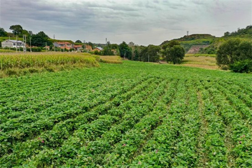 金秋时节,在夏店镇富庄沟村,郁郁葱葱的红薯叶铺满田间,沉甸甸的苹果缀满枝头,宛如一幅青山环抱下的绿色画卷。