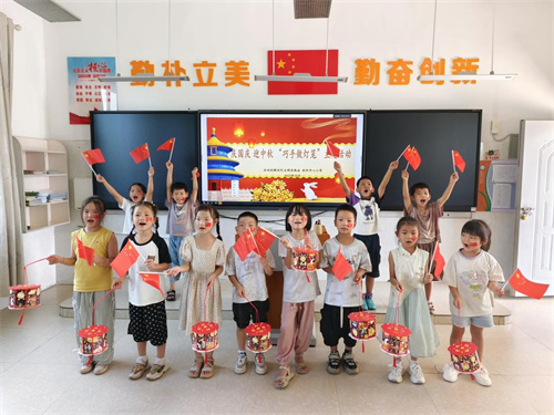 当所有花灯制作完成后,活动迎来了最令人动容的环节。志愿者们为每个孩子分发了小国旗,孩子们小心翼翼地将国旗握在手中,另一只手高高举起自己亲手制作的国旗花灯,脸上洋溢着自豪的笑容。随着激昂的国歌旋律响起,孩子们齐声高唱,稚嫩却坚定的歌声在校园里回荡。一张张纯真的脸庞、一盏盏闪耀的花灯、一面面飘扬的国旗,构成了双节前夕最动人的画面,爱国之情与节日喜悦在歌声中深深扎根在每个孩子心中。