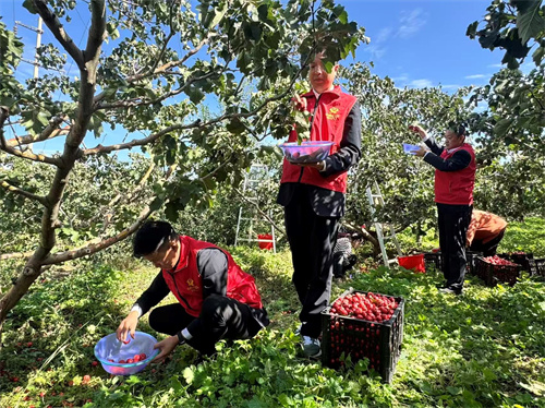 雨后的田野,泥泞难行,却阻挡不了志愿者们助农的热情。采摘、分拣、装袋、搬运……志愿服务队的成员们分工明确,干劲十足。那一抹抹穿梭于果树间的“志愿红”,在山楂林中格外醒目,构成了秋日田间最温暖、最动人的风景。他们不顾泥巴沾满鞋裤,与时间赛跑,与天气抗争,手脚麻利地忙碌着,心中只有一个朴素的信念:多摘一筐果,果农就少一分损失。