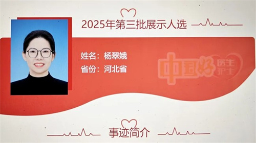 由中央精神文明建设办公室和国家卫生健康委联合开展的“我推荐我评议身边好人”之“中国好医生、中国好护士”2025年第三批展示人选网上评议环节正式启动。河北省宁晋县中西医结合医院脑病科主任、副主任医师杨翠娥入围展示人选。