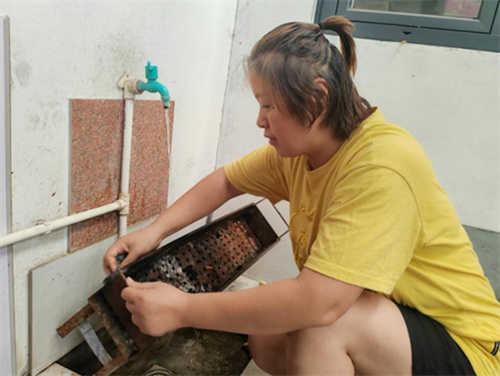 (图为:王京刚媳妇李艳华正在收拾烧烤架)