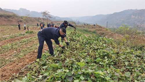 在红薯地里,民警们分工明确、干劲十足。有的弯腰刨土、小心翼翼拔出红薯,有的负责分拣装筐、动作娴熟又认真。