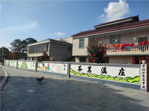 (“庄溪茗茶”彩色壁画、“文化振兴”—庄埠特色文化展馆、“产业振兴”——庄溪茶场)