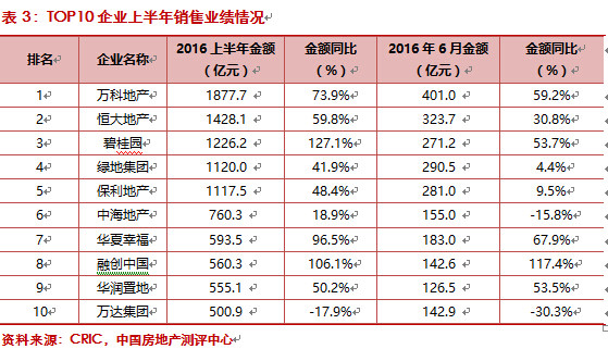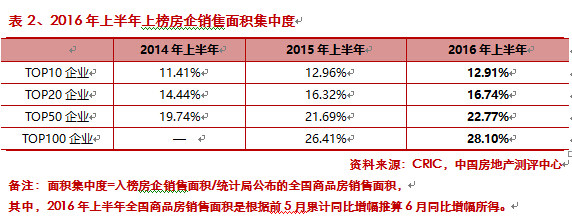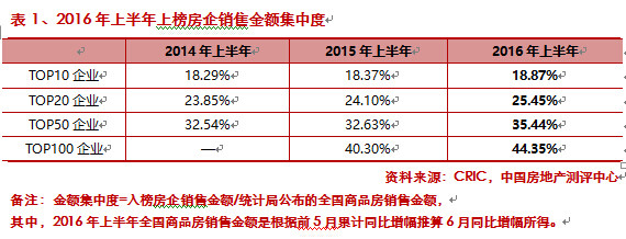 2016年上半年房企销售快速增长,行业集中度进一步提升。受改善型需求上升的影响,百强房企销售均价提升明显,金额集中度的增速整体高于面积集中度。