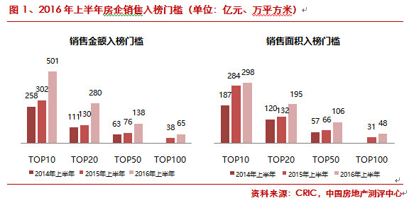楼市火爆,开盘日光。2016年上半年,TOP100房企销售金额和面积门槛均大幅提升,多数房企创下了历史最好成绩。全年千亿房企有望再次扩容,大中型房企的行业地位竞争也愈发激烈。