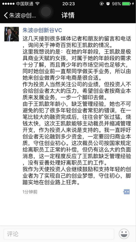 而对于久经商场、阅人无数的投资人来说,王凯歆是有话题性的创业者。95后、高中辍学这些关键词都充满爆点。创新谷态度仍然是力挺王凯歆,朱波发布朋友圈说:在王凯歆的年龄段,她是一个极具商业天赋的女孩。对于近期的裁员事件,他认为,王凯歆由于缺乏管理经验,扩张过猛,这次主动裁员缩减管理开支,作为投资人是支持的。 记者也向神奇百货的A轮投资方真格基金询问此事,截至发稿,对方并未就此事给予回应。