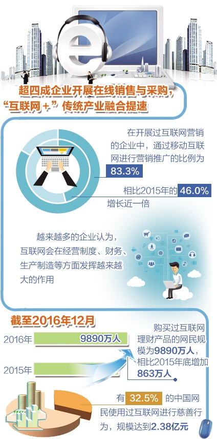 报告显示,我国境内外上市互联网企业数量达到91家,总体市值为5.4万亿元。其中,腾讯和阿里巴巴的市值总和超过3万亿元,占中国上市互联网企业总市值的57%。企业在线销售、在线采购的开展比例实现超过10个百分点的增长,分别达45.3%和45.6%。互联网在企业营销体系中扮演的角色愈发重要,互联网营销推广比例达38.7%。