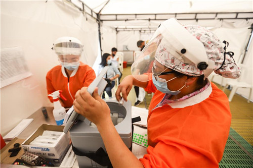 2021年9月16日,工作人员在哥伦比亚首都波哥大的黄金广场购物中心疫苗接种点忙碌。(新华社发)