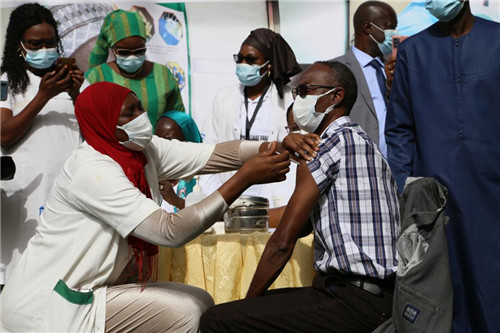 2021年2月23日,塞内加尔传染病学专家穆萨·赛义迪(前右)在首都达喀尔接种中国新冠疫苗。(新华社记者邢建桥摄)
