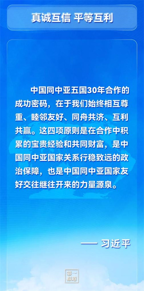 中国同中亚五国30年合作的成功密码,在于我们始终相互尊重、睦邻友好、同舟共济、互利共赢。这四项原则是在合作中积累的宝贵经验和共同财富,是中国同中亚国家关系行稳致远的政治保障,也是中国同中亚国家友好交往继往开来的力量源泉。