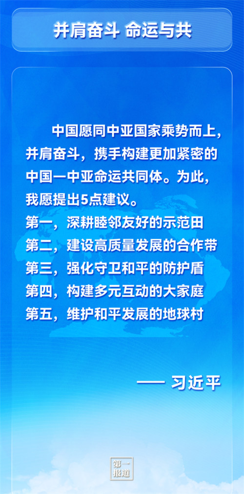 中国愿同中亚国家乘势而上,并肩奋斗,携手构建更加紧密的中国-中亚命运共同体。为此,我愿提出5点建议。