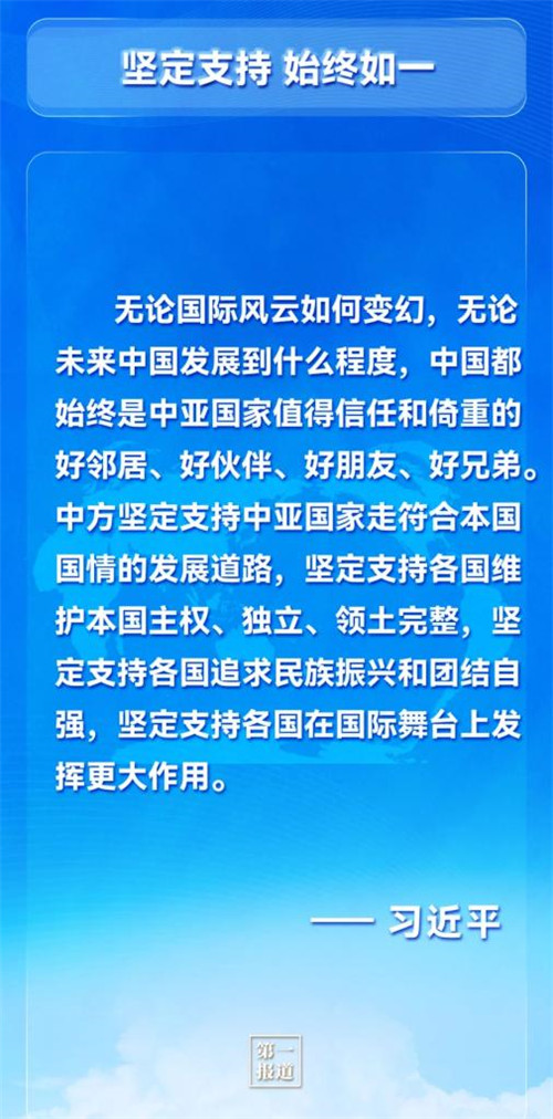 岁月不居,时光如流。无论国际风云如何变幻,无论未来中国发展到什么程度,中国都始终是中亚国家值得信任和倚重的好邻居、好伙伴、好朋友、好兄弟。中方坚定支持中亚国家走符合本国国情的发展道路,坚定支持各国维护本国主权、独立、领土完整,坚定支持各国追求民族振兴和团结自强,坚定支持各国在国际舞台上发挥更大作用。