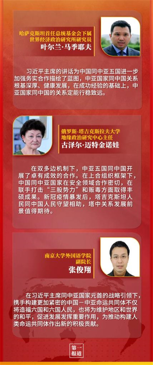 习近平主席和五国元首一起观看了中国同中亚国家关系发展中历史性瞬间的视频,在热烈、隆重、友好的气氛中共同总结经验,展望未来。习近平主席发表题为《携手共命运 一起向未来》的重要讲话。多国人士认为,中国和中亚五国共同宣布打造中国-中亚命运共同体,开启了相互关系的新时代。