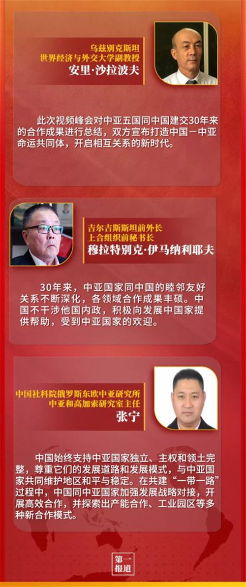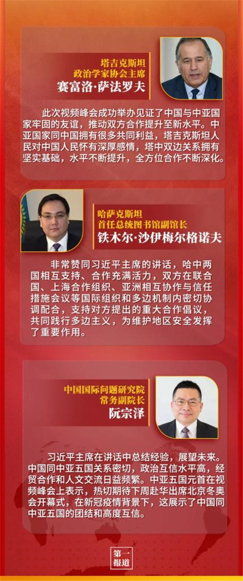 此次视频峰会,是30年来中国同中亚五国元首第一次集体会晤,具有里程碑意义,充分体现了中国和中亚五国政治互信和睦邻友好合作的高度和深度。