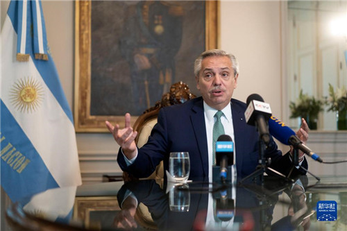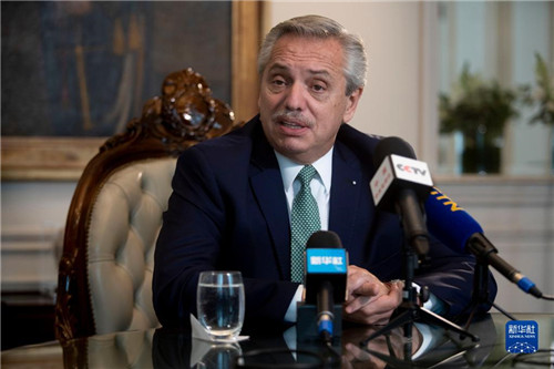 1月25日,阿根廷总统费尔南德斯在首都布宜诺斯艾利斯的总统府玫瑰宫内接受新华社记者采访。新华社发(马丁·萨巴拉摄)